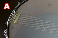 の反応を良くするためです。スナッピーは下の写真でご覧の通りワイヤーの束で、スチール、ベルブラスなど金属素材も多種、塗装してあるもの、無いもの様々です。スナッピーはシェルに取り付けてあるスイッチ(ストレイナー)でON、OFFが可能です。OFFで叩くとスネアは「トントントン」という普通の小太鼓の音しかしません。スネアならではの「タン」とか「パン」とかいうサウンドは、スナッピーによるものなのです。